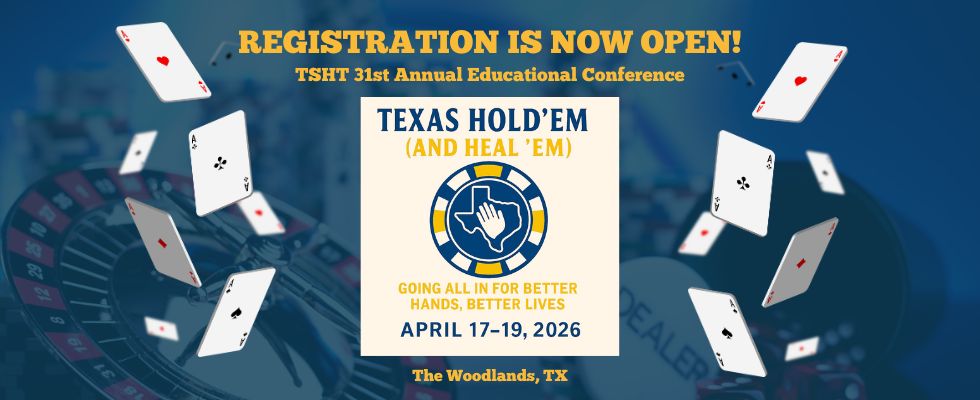 Welcome to the Texas Society for Hand TherapyThe Texas Society for Hand Therapy seeks to promote the field of hand therapy through education, research, and fellowship. The members of the TSHT are occupational or physical therapists, many of whom have attained the Certified Hand Therapist designation, occupational or physical therapist assistants, students, physicians, or other professionals who are advocates of the field of hand therapy. TSHT Mission StatementThe mission of the Texas Society for Hand Therapy is charitable, educational, and scientific as defined in Section 501(c)(3) of the Internal Revenue Code, including but not limited to the promotion of education, research, and advancement of science in the field of hand therapy. The Corporation intends to fulfill its mission through communication, education, research, and the establishment of clinical standards. We seek to bring hand therapists and colleagues in the medical community together, providing the opportunity to maintain highest methodologies in the clinic while creating new innovative ways to treat patients, blending evidence based science and art. Ultimately, our goal is to provide a platform for hand therapists to maintain clinical standards and an independent status in healthcare, keeping awareness with our policy makers and advocating ethical fees for service. Announcements